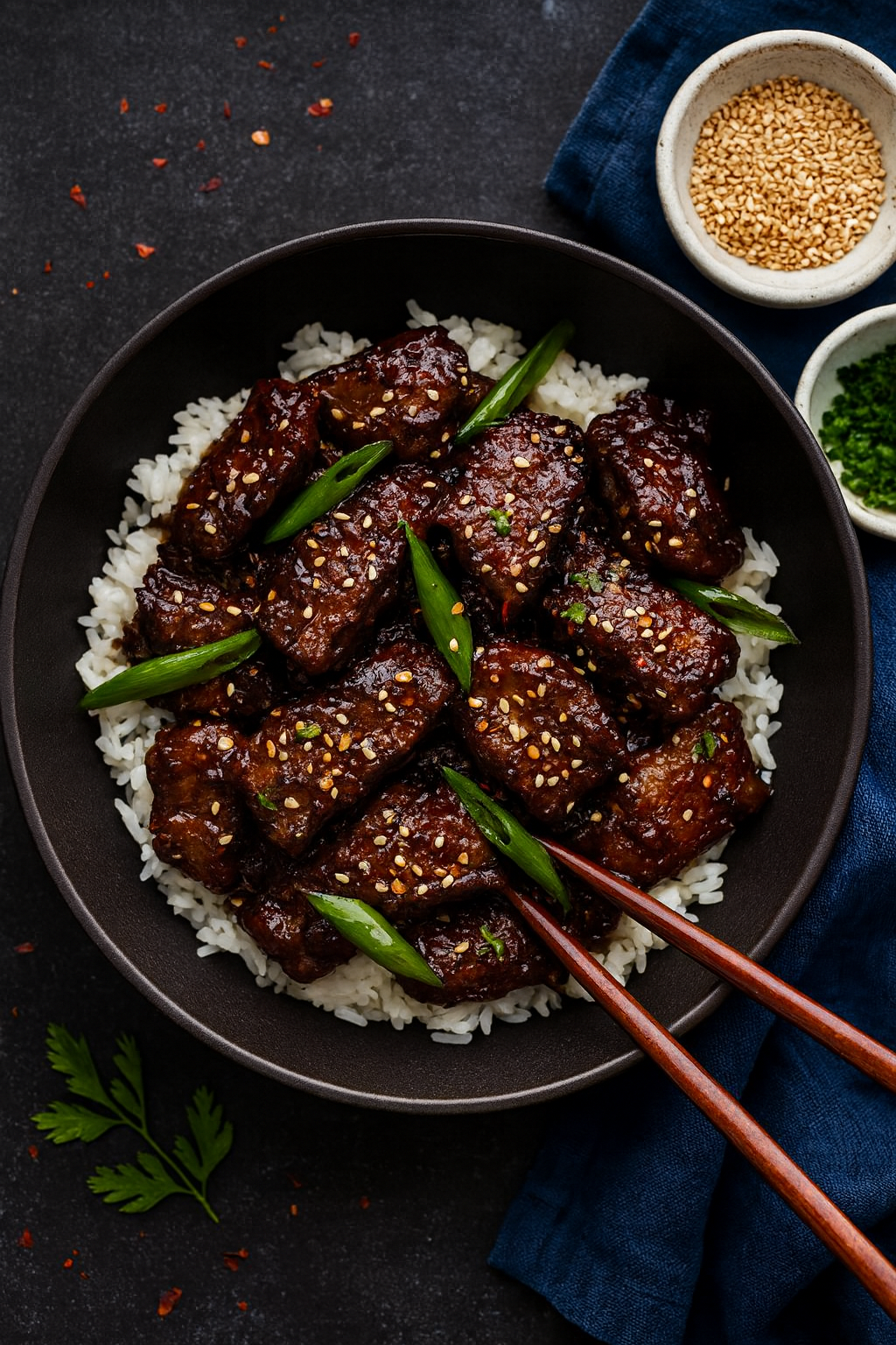 This sticky Mongolian beef bowl is a fast, flavor-packed dinner made with crispy pan-seared steak tossed in a glossy garlic-ginger sauce. Served over rice with scallions and sesame seeds, this homemade takeout classic comes together in under 25 minutes and delivers sweet, savory, restaurant-quality flavor in every bite. Perfect for weeknight meals, meal prep, and quick skillet dinners.